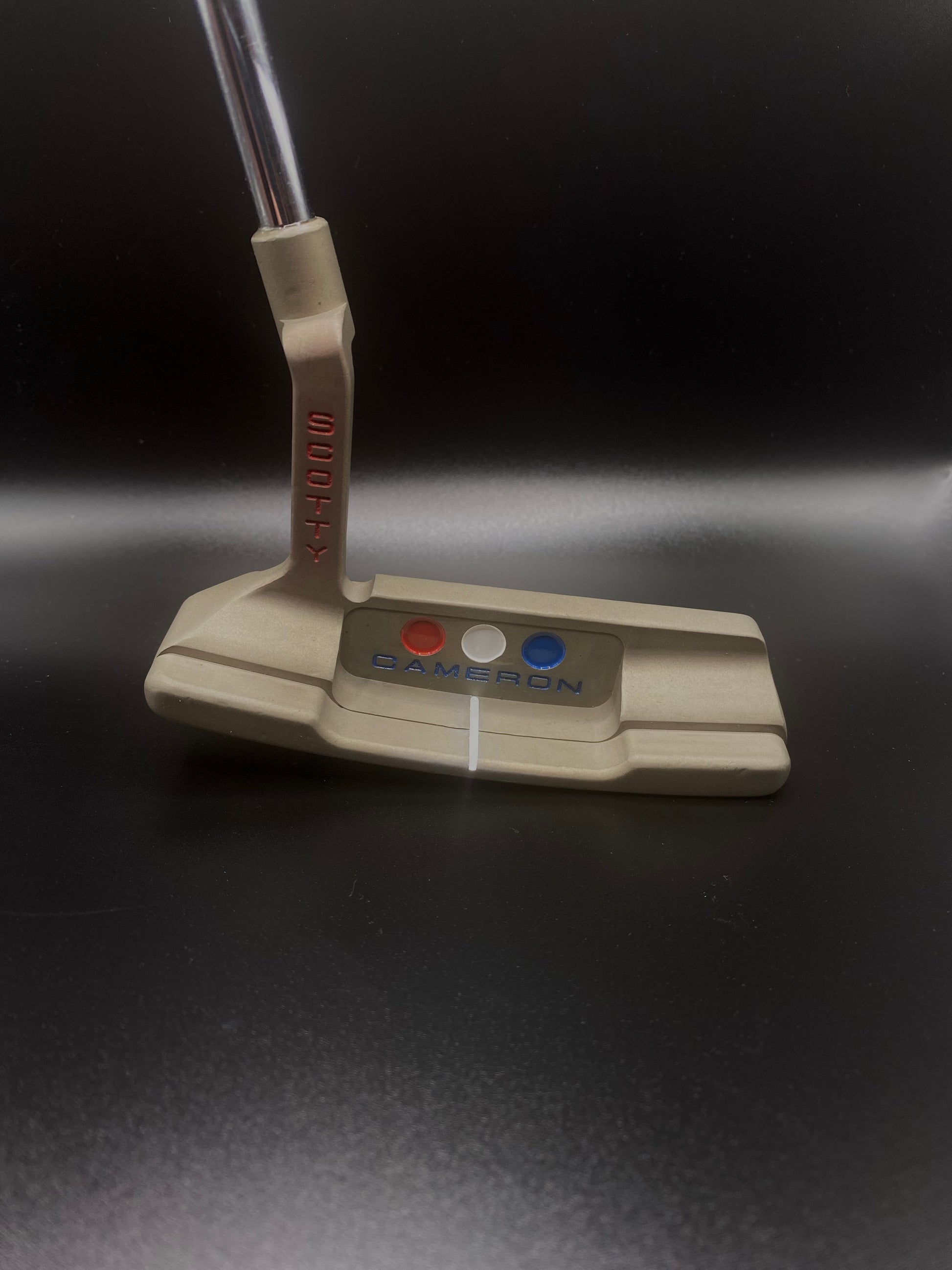 2006 Scotty Cameron Studio Select completely refurbished and customized with an American theme. Bead-blasted for a matte texture and torched to a golden brown finish. RWB cherry bombs in the back cavity and front face.